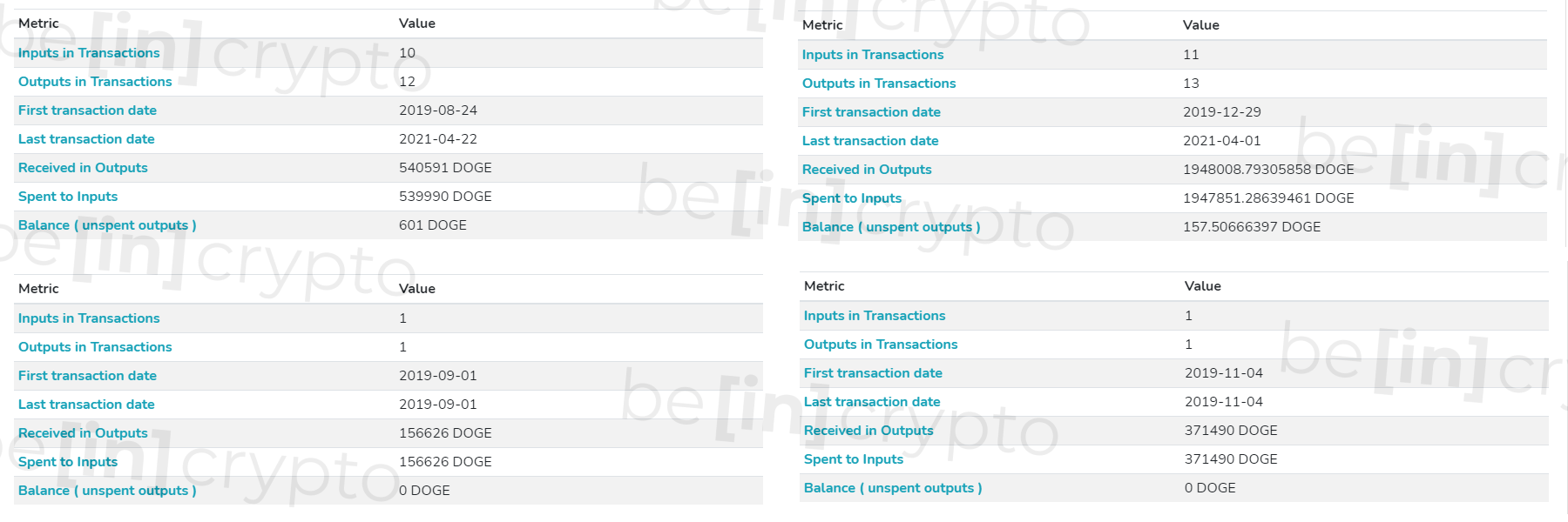 Однако картина выглядит иначе по суммарному обороту. Как видно на изображении выше, на некоторых адресах DOGE находился в обороте с 2019 года, а суммарные объемы оборота в некоторых кошельках приближаются к $500 000.