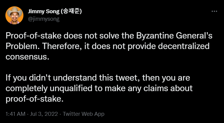Один из главных сторонников биткоина Джимми Сонг раскритиковал неспособность алгоритма Proof-of-Stake противостоять «проблеме византийских генералов»