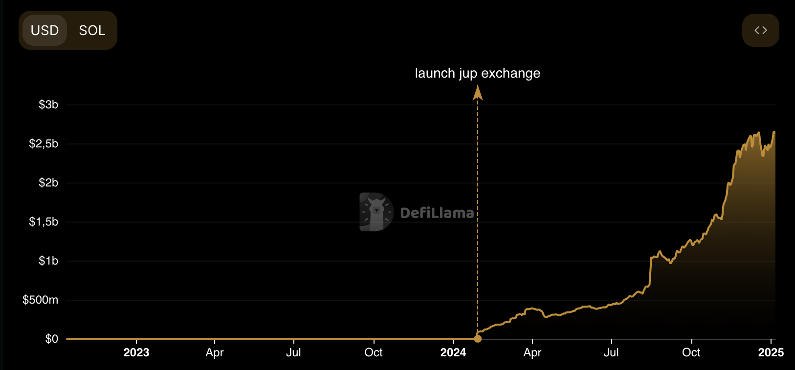 По данным DefiLlama, на момент написания материала общая стоимость заблокированных активов (TVL) Jupiter составляет $2,63 млрд. По этому показателю агрегатор DEX занимает вторую строчку в списке крупнейших проектов на Solana.