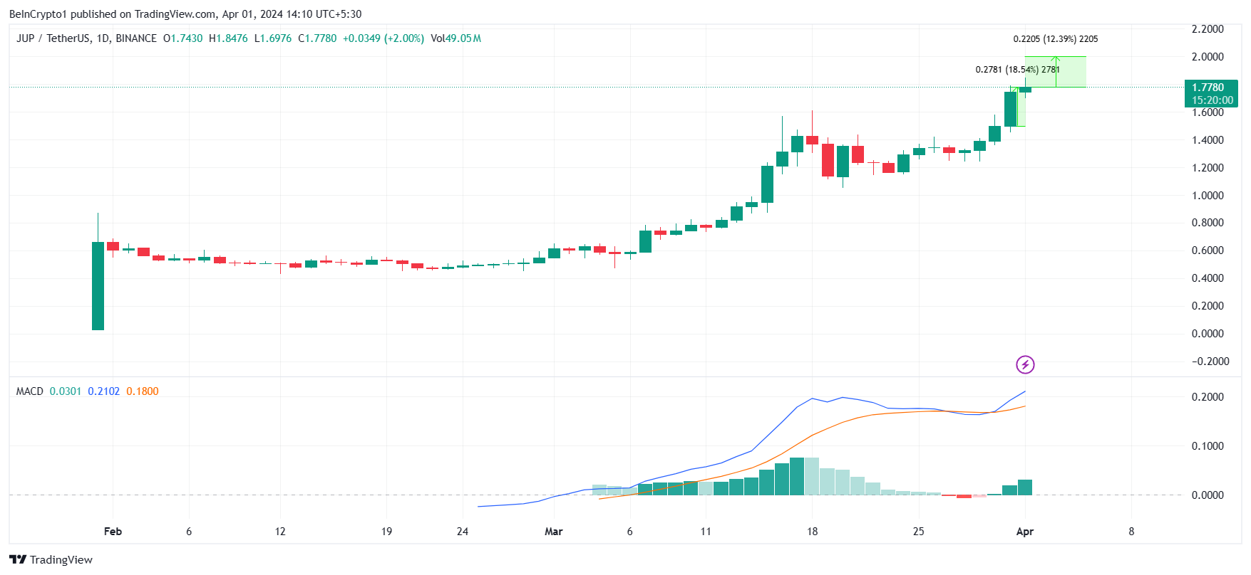 Jupiter запустил собственный токен JUP еще в конце января. Однако настоящий прорыв произошел только в прошлом месяце. Альткоин вырос с $0,47 до $1,80 на момент написания статьи, показав за последние 24 часа прирост почти на 19%.
