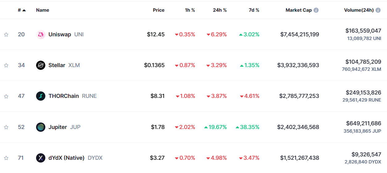 При этом монета превзошла по рыночной капитализации такие криптовалюты, как Synthetix (SNX) и dYdX (DYDX). Теперь Jupiter является четвертым по величине DEX-токеном с рыночной капитализацией $2,4 млрд. Если рост продолжится, то следующей целью JUP может стать ThorChain (RUNE).