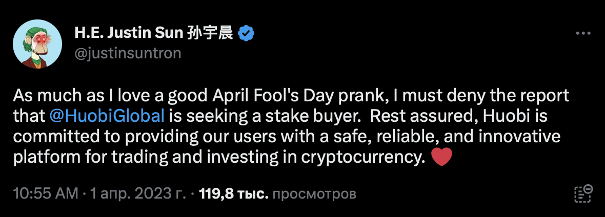 В твите от 1 апреля Джастин Сан заявил, что он любит хорошие первоапрельские розыгрыши, но все же вынужден опровергнуть это сообщение.