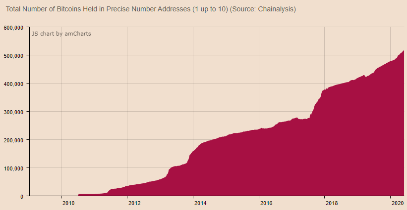 В апреле этого года, количество адресов с количеством биткоинов от 1 до 10 единиц превысило 500 000 штук.