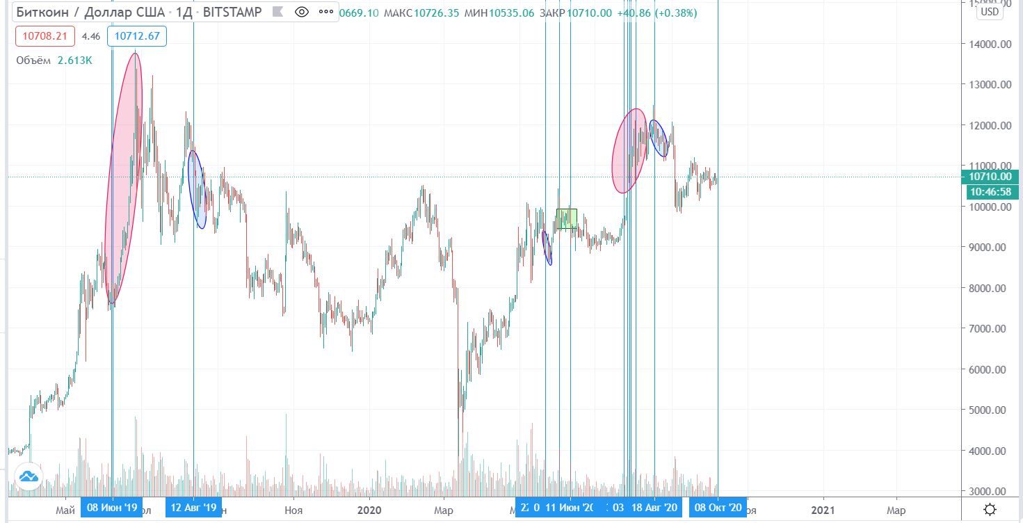 - Розовыми овалами отмечен выход биткоина в рост на фоне переводов мошенниками украденных с BitFinex средств.