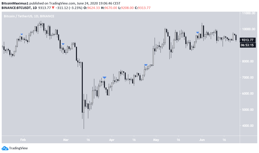 Любопытно, что в четырех из этих пяти случаев курс BTC формировал медвежьи свечи на дневных графиках. Однако в целом движения были достаточно скромными, от +0,2% (24 апреля) до -5,5% (27 марта). В большинстве случаев биткоин формировал небольшие свечи с короткими фитилями в обоих направлениях, что говорит о нерешительности участников рынка.