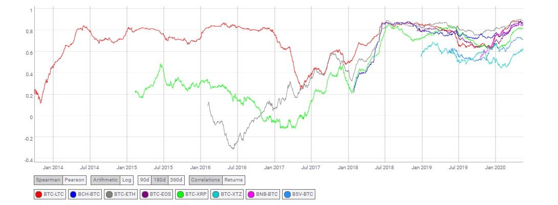 Поскольку биткоин является основной криптовалютой, его развитие задаёт вектор альткоинам. Коэффициент корреляции цен на биткоин и другие криптовалюты показывает график ниже.