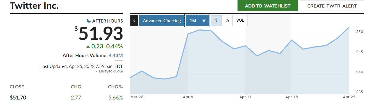 Ранее, 4 апреле 2022 года, в сети появилась информация о покупке Илоном Маском 9,2% акций Twitter за $2,89 млрд. Благодаря сделке предприниматель стал одним из крупнейших акционеров социальной сети. На фоне новостей о покупке Илоном Маском доли Twitter и объявления о полной передаче контроля над платформой бизнесмену акции компании продемонстрировали рост.