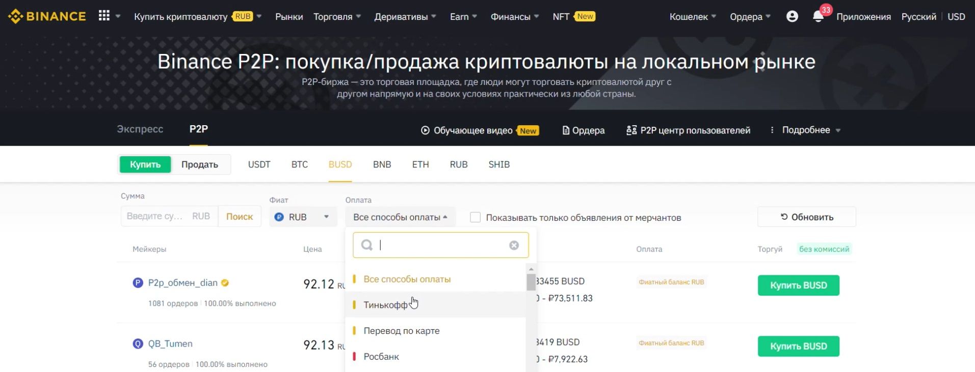 SponsoredДля начала ищем на Binance раздел «купить криптовалюту» и нажимаем на клавишу «P2P-торговля». Система откроет платформу, на которой потребуется выбрать подходящее предложение. Например, мы хотим купить стейблкоин Binance – BUSD на 2 тысячи рублей, оплатив покупку с рублевой карты Тинькофф. Для этого: