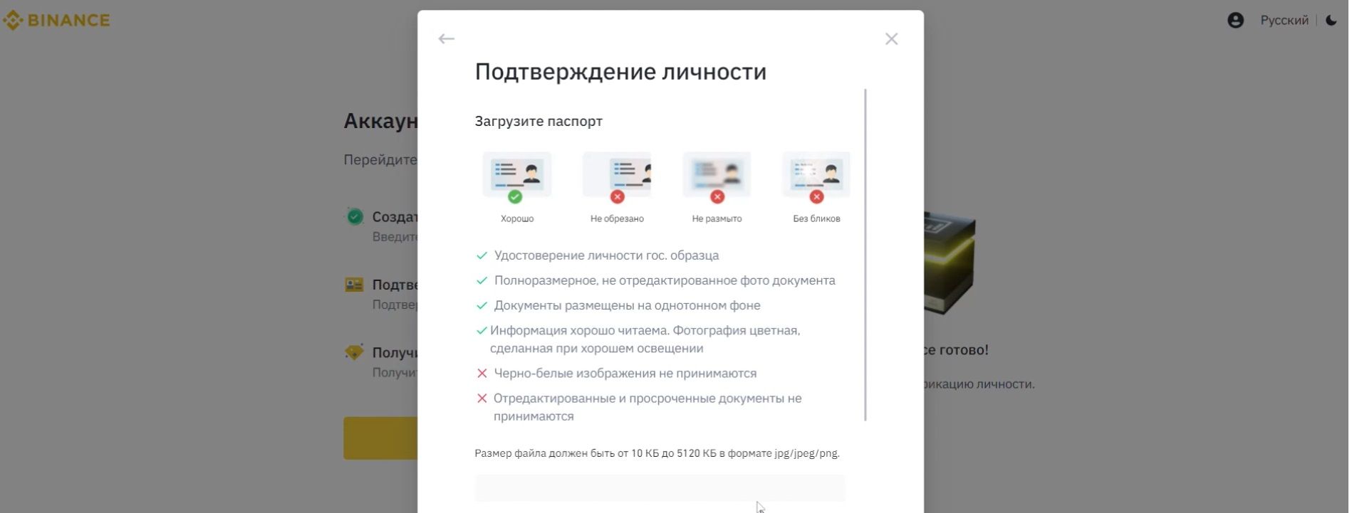Для верификации нужен документ, подтверждающий личность, например, паспорт. Binance попросит предоставить его скан или фотографию в хорошем разрешении. Важно, чтобы информацию на документе можно было легко прочитать. Также Binance запросит селфи. Фото должно быть без фильтров.