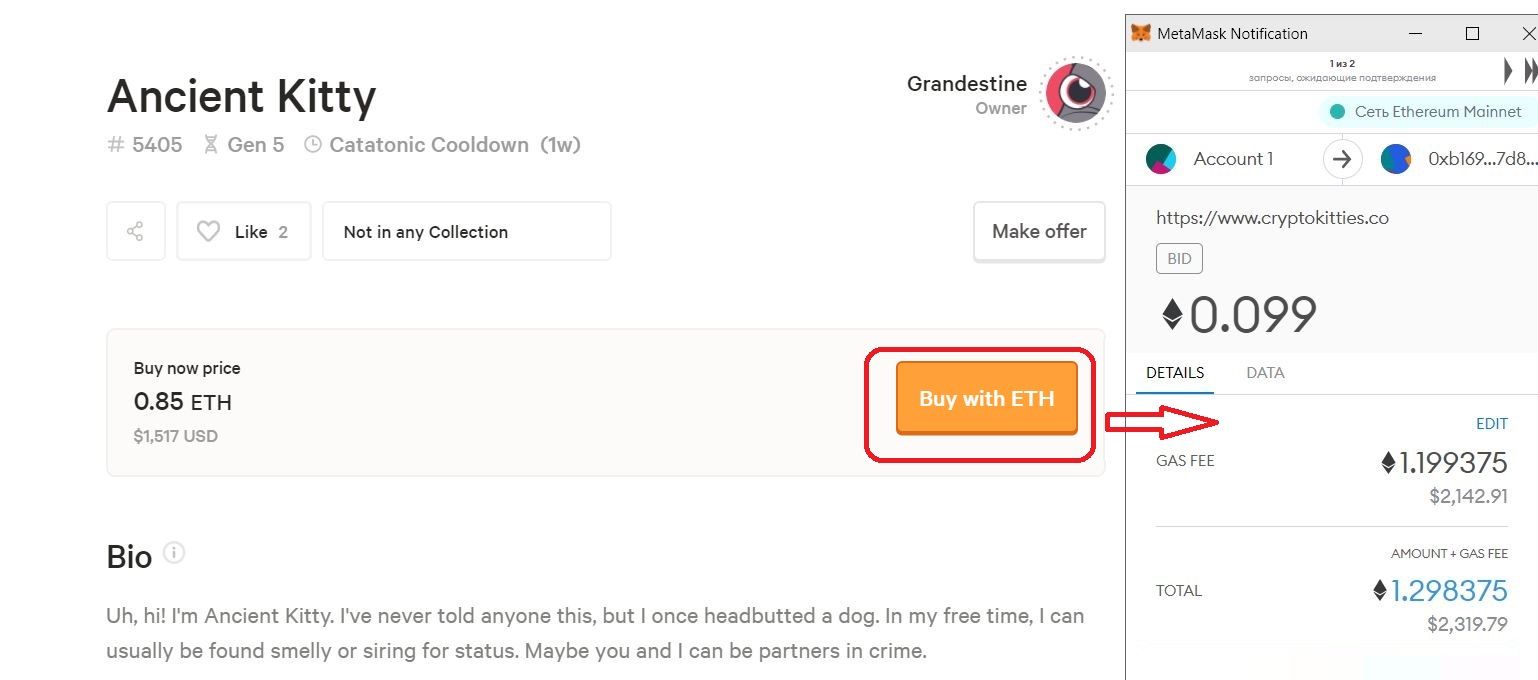 Sponsored SponsoredВ каждой карточке котика указаны его данные, включая возраст. Для приобретения нужно нажать на клавишу «buy with Ethereum». После система откроет окно MetaMask, с которого можно произвести оплату.