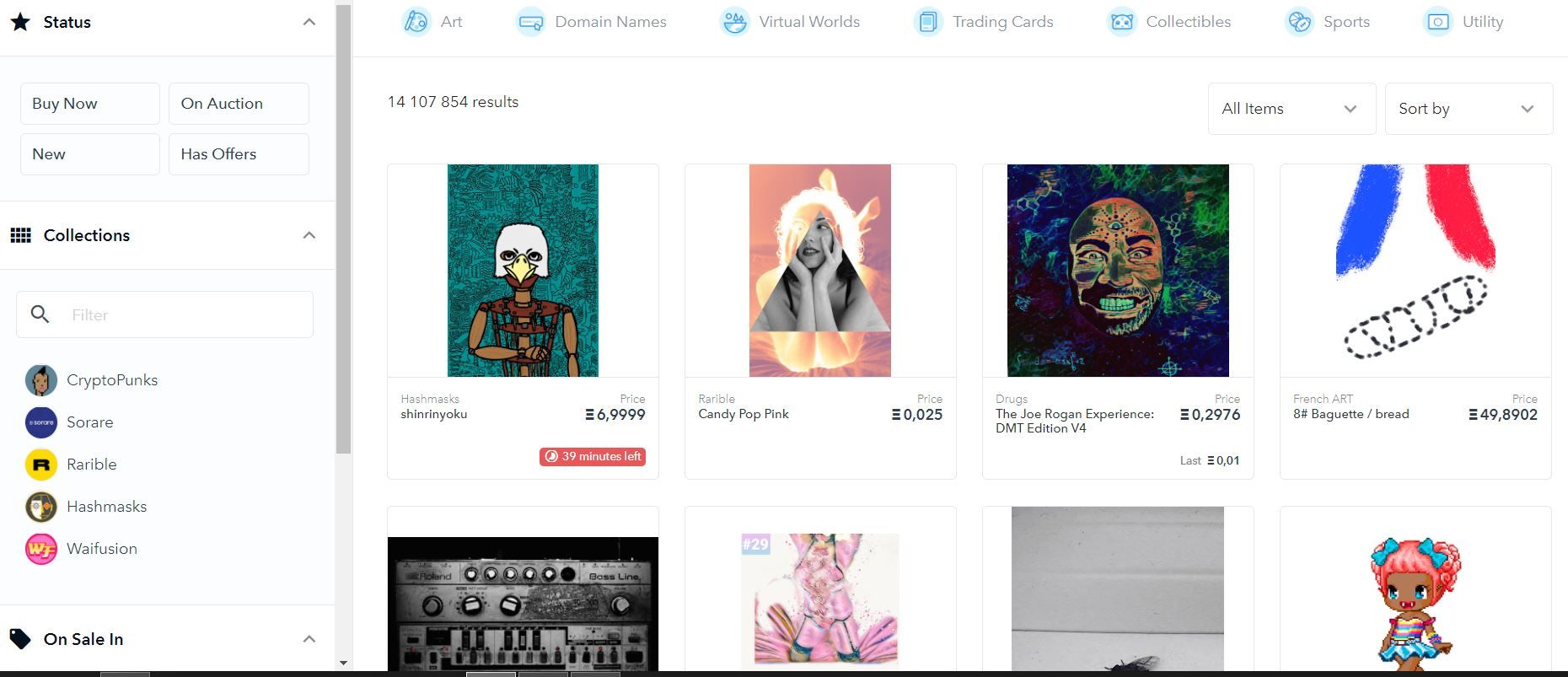 Также на OpenSea можно выбирать категории невзаимозаменяемых токенов. Например, пользователь может вывести список NFT, которые имеют отношение к искусству. Также результаты можно отсортировать по определенному признаку. Например, по возрастанию цены.