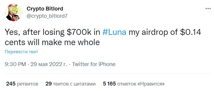 Многие участники криптоиндустрии также пожаловались на несправедливо маленькие выплаты по аирдропу. Например, известный аналитик, ведущий микроблог под ником Crypto Bitlord, рассказал о том, что он получил в рамках раздачи $0.14. При этом его реальные потери в LUNA составили $700 тыс.