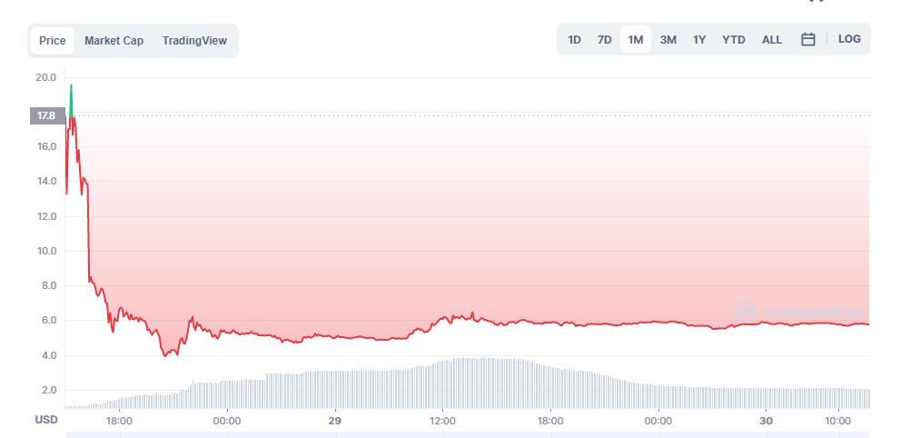 Sponsored SponsoredВажно! По состоянию на момент написания материала, LUNA торгуется на 70.50% ниже максимума $19.54, зафиксированного в день запуска торгов монеты.