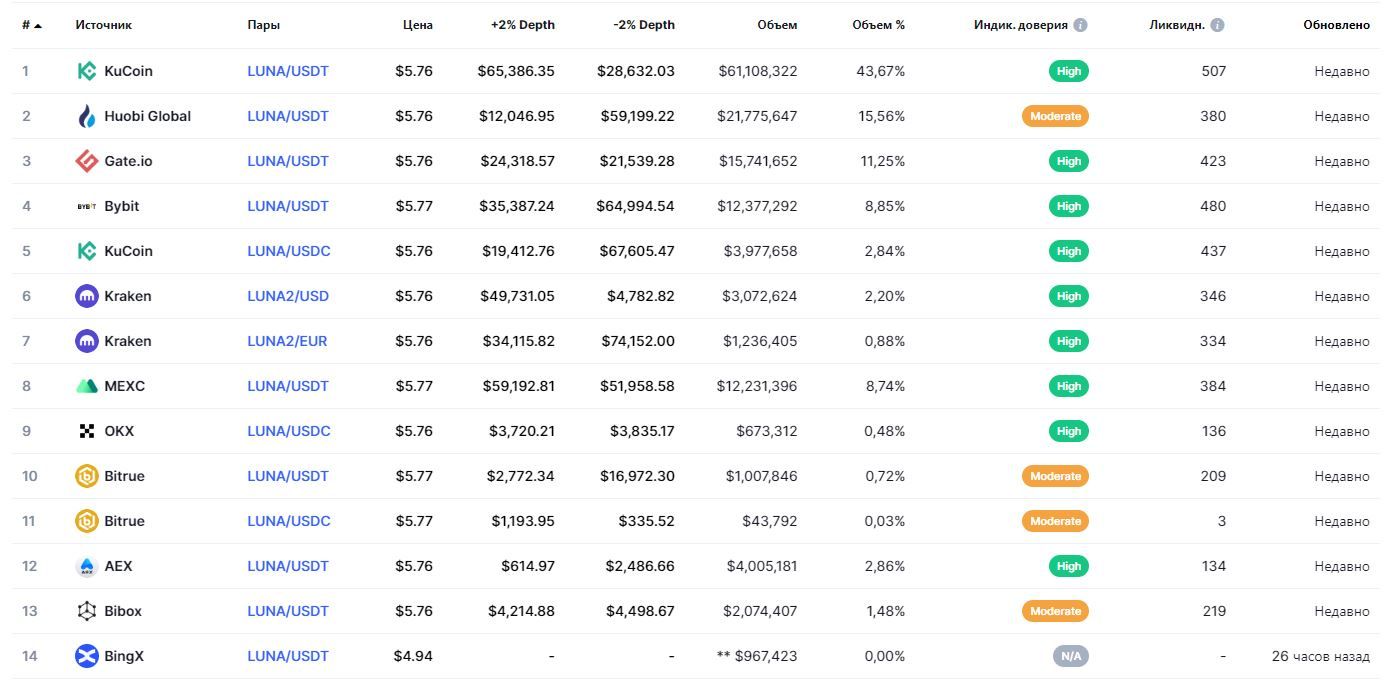 Многие криптобиржи оперативно добавили монету в свой листинг. Купить LUNA можно, например, на KuCoin, Huobi или Kraken. Некоторые торговые платформы, включая Binance, проводят подготовку к листингу монеты.