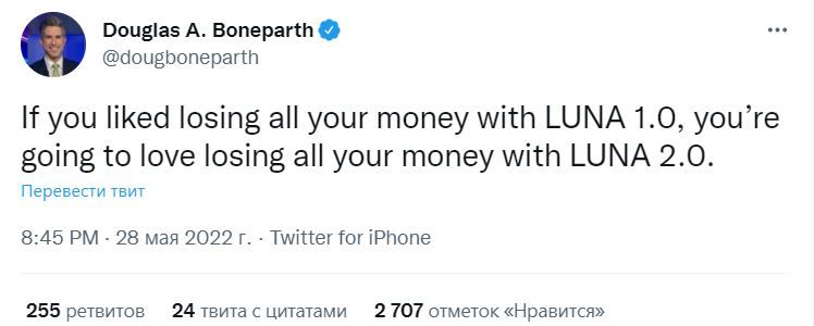 «Если вам понравилось терять все деньги с LUNA 1.0, вам также понравится терять деньги с LUNA 2.0», — написал он в своем микроблоге.