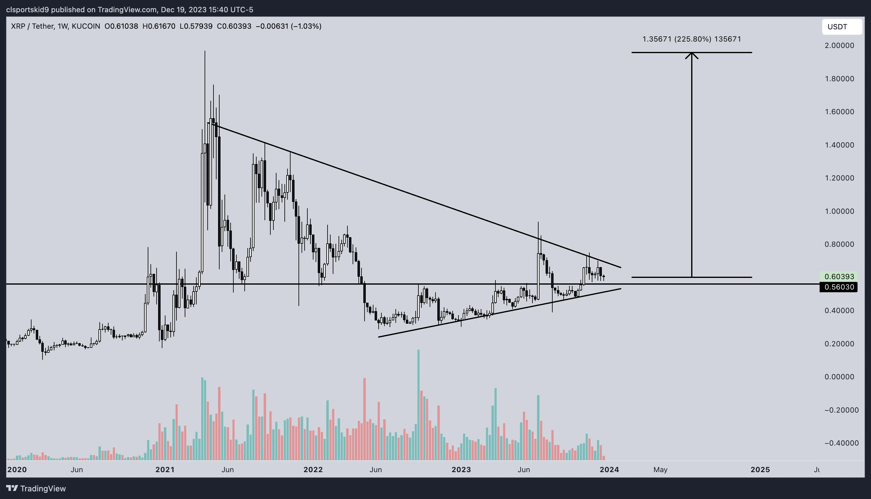 @Louie настроен по-бычьи, поскольку считает, что цена XRP выйдет из долгосрочного симметричного треугольника.