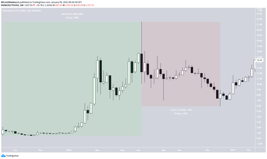 Свое первое значимое ралли ETH устроил в период с августа 2015 по июнь 2016 года. За это время его курс вырос от минимума $0.50 к максимуму $21.49. Прирост цены за 308 дней составил 4200% (выделено зеленым цветом на графике ниже).
