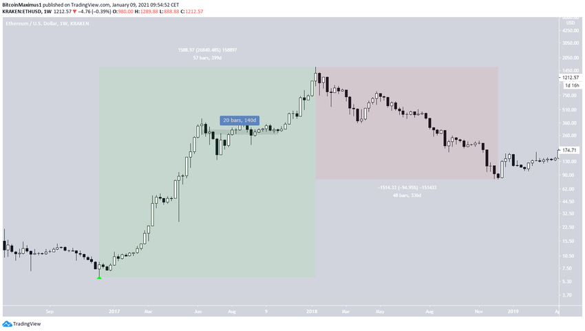 За 399 дней (зеленый цвет на графике) ETH укрепился на впечатляющие 26 840% и в январе 2018 года достиг максимума на $1594. Эта высота ознаменовала новый рекордный максимум, и она до сих пор остается непокоренной.