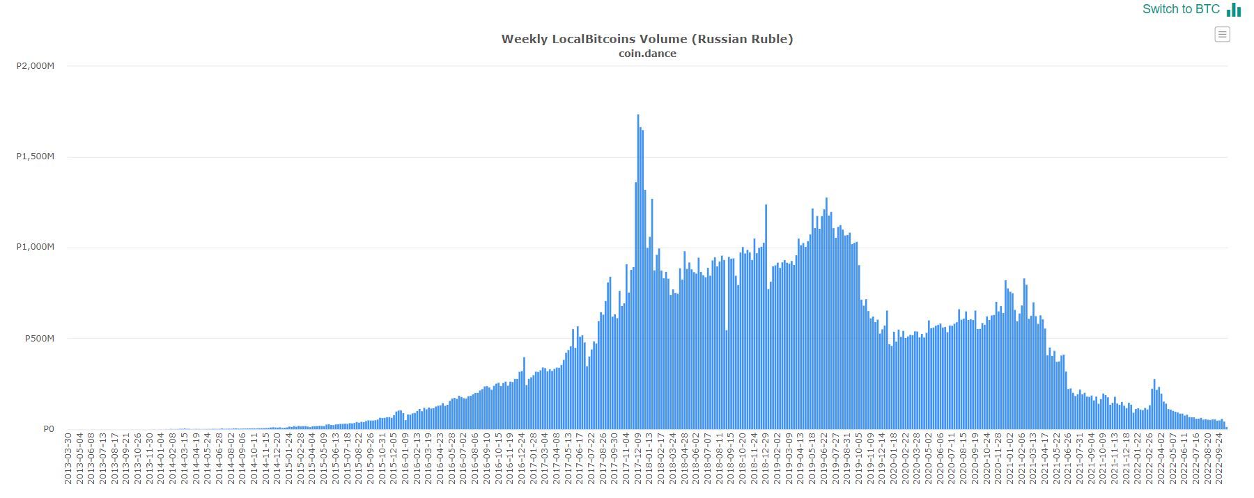На фоне ввода криптосанкций против России объем покупок биткоинов за рубли продолжил снижаться. На это указывают данные LocalBitcoins.