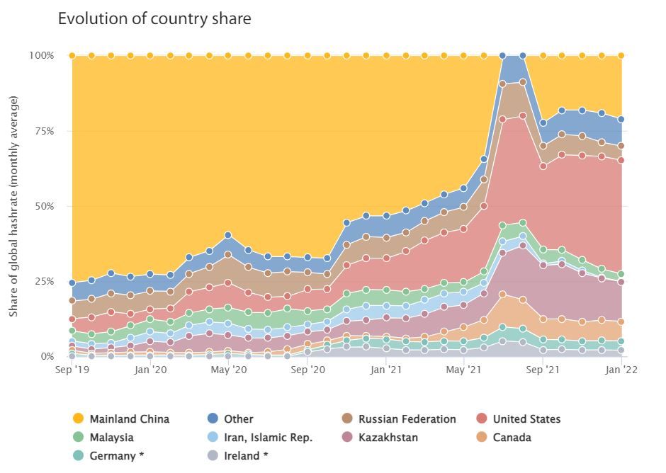 К маю 2022 года Россия, по данным Кембриджского центра альтернативных финансов (CCAF), опустилась на пятую строчку рейтинга крупнейших центров добычи криптовалюты. РФ, в том числе, обошла Канаду.