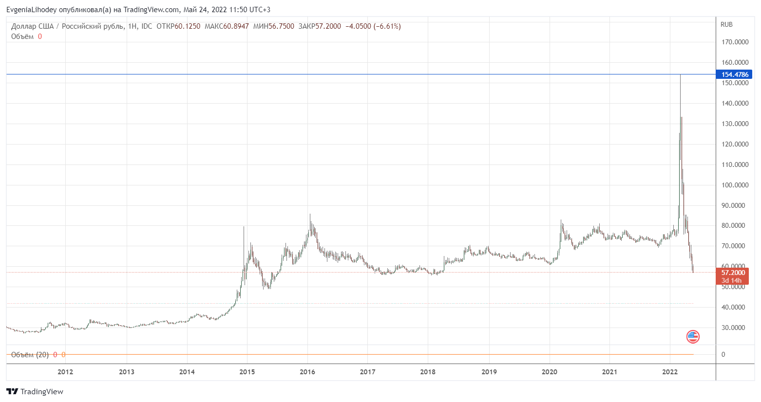 После 14 марта национальная валюта РФ начала укрепляться по отношению к доллару. По состоянию на момент написания материала, рубль торгуется по ₽57 за $1.