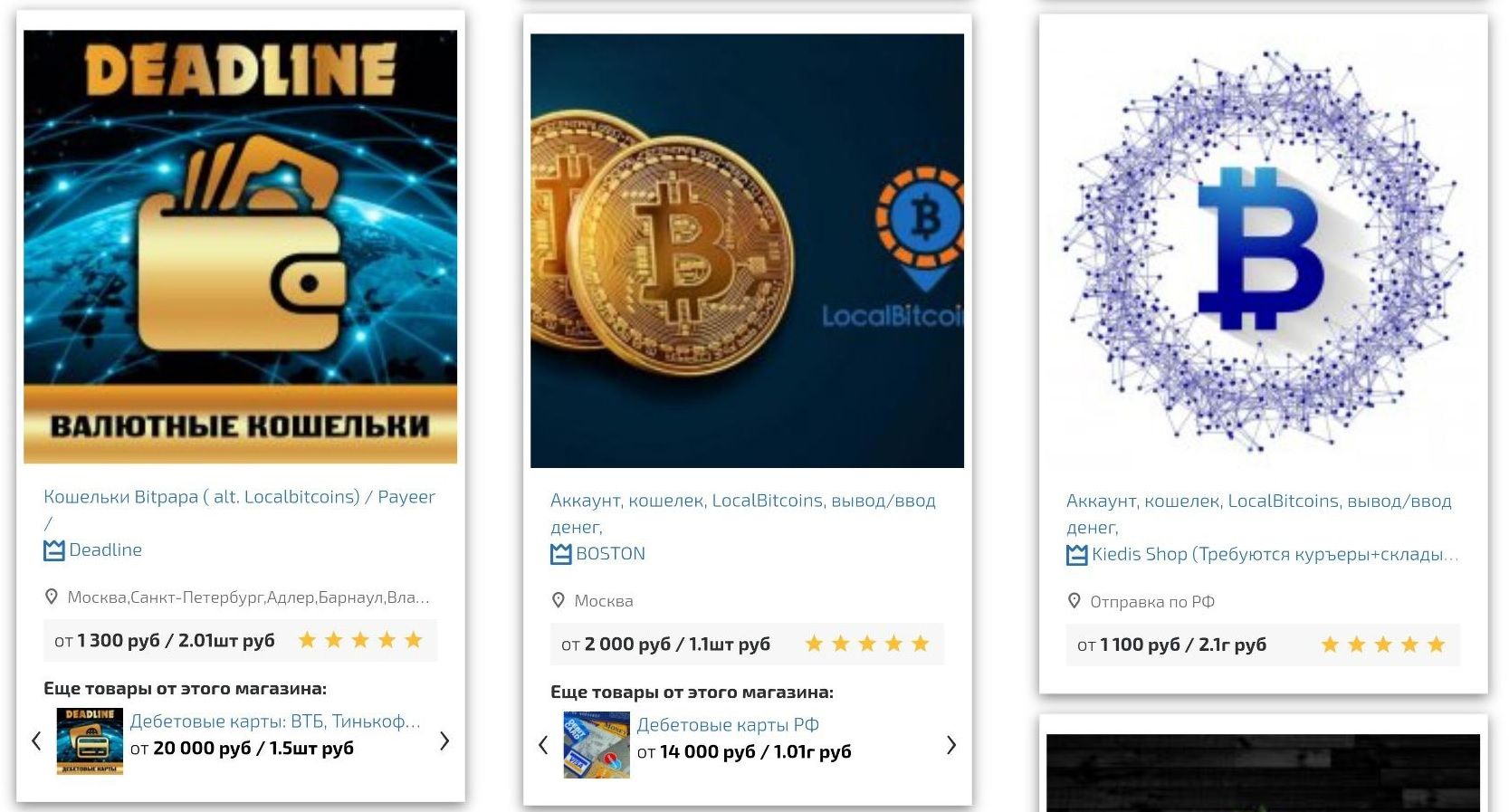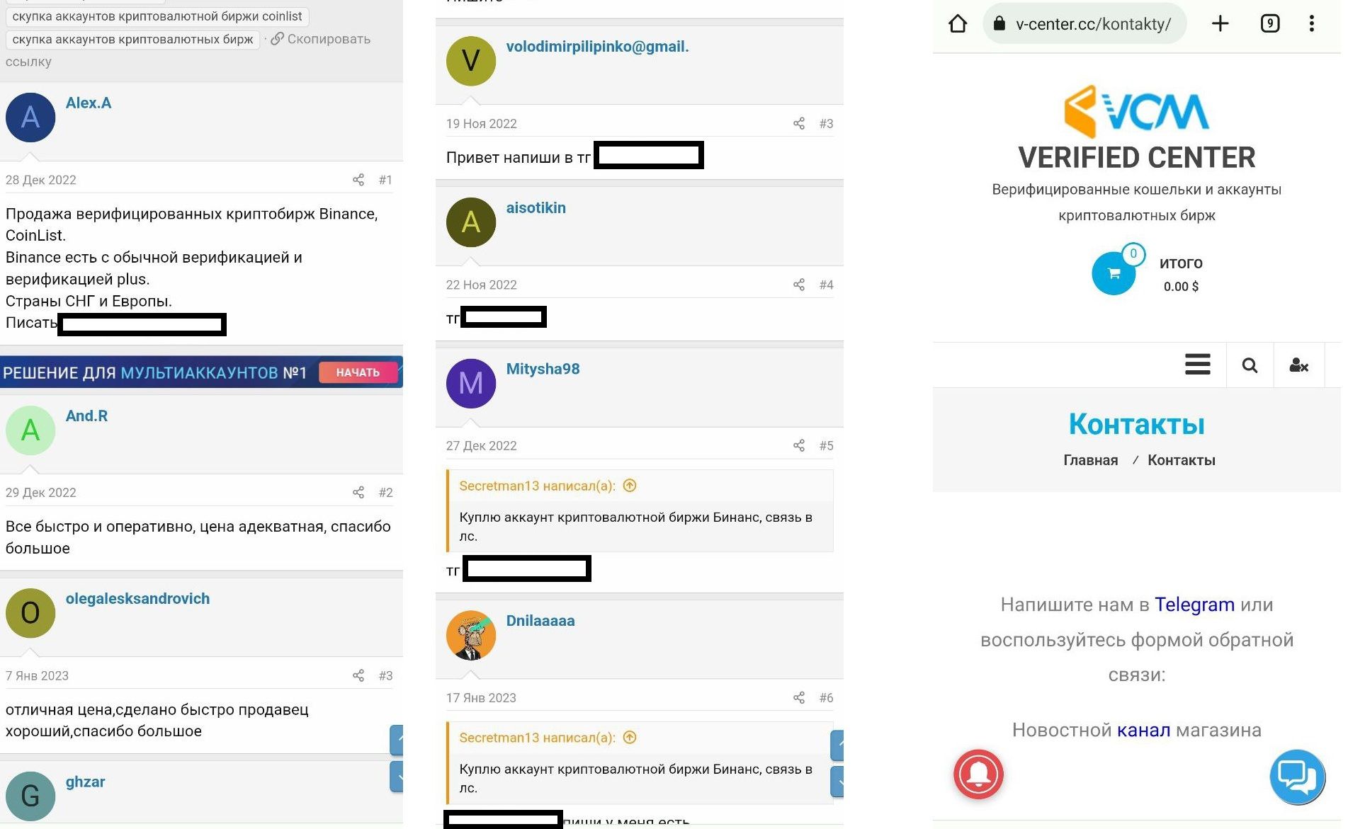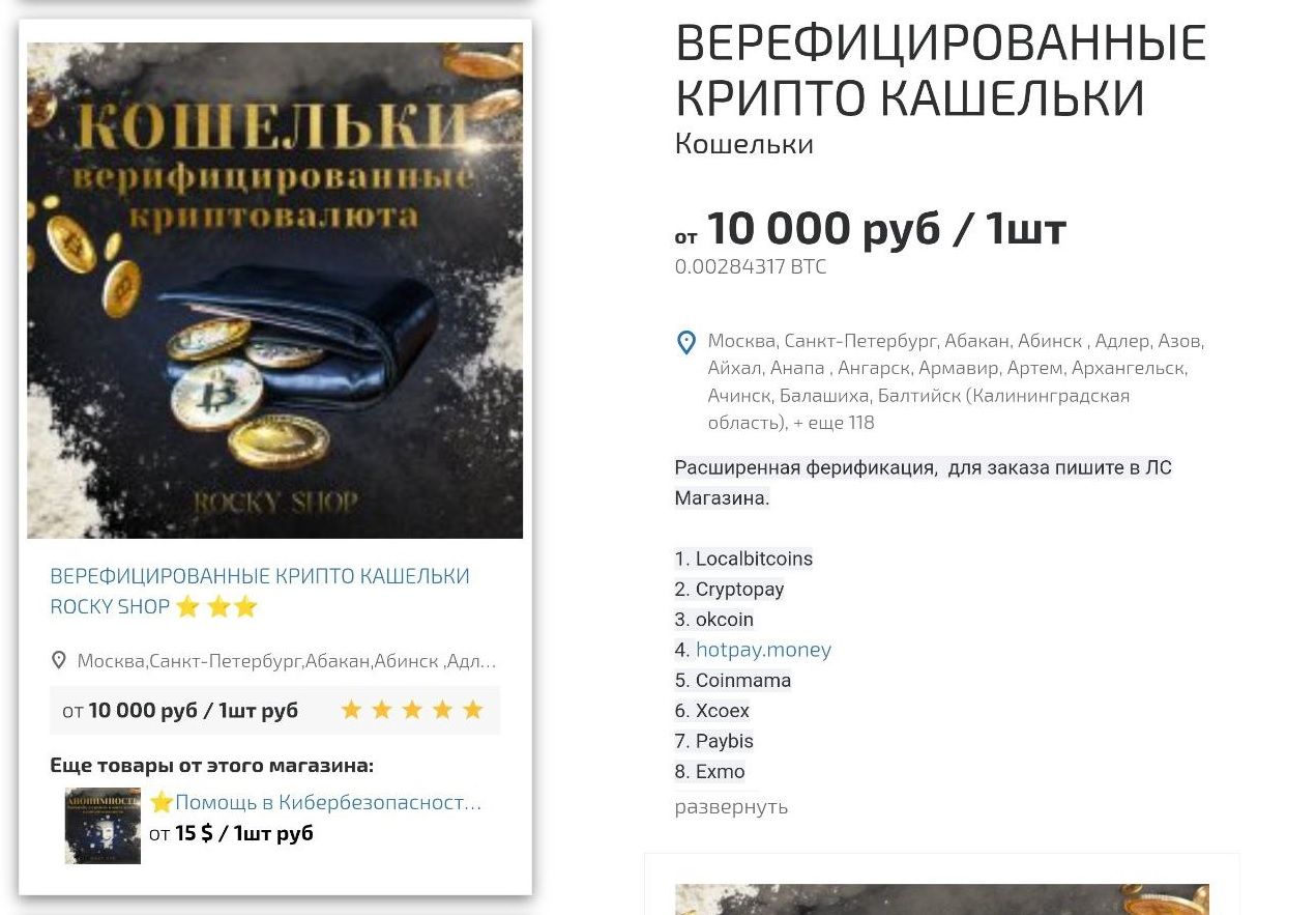 Найти предложения о продаже аккаунтов криптобирж и других криптоплатформ можно как на теневых маркетплейсах, так и на различных площадках в открытом сегменте интернета, вбив в браузере интересующий запрос. Вот примеры объявлений с маркетплейса «Гидра»: