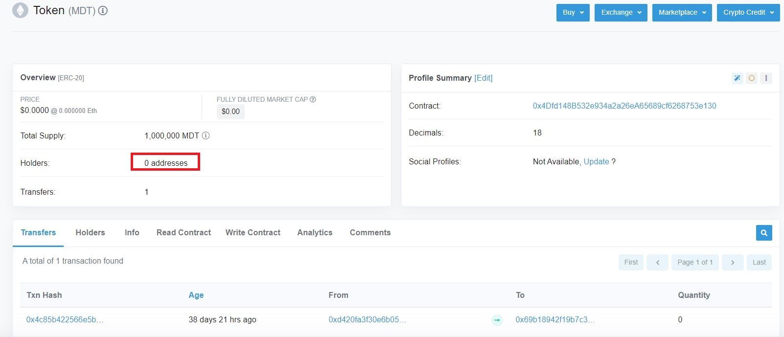 При помощи монеты клиенты MonolithosDAO смогут принимать решения. Именно MDT организаторы стартапа предлагают приобрести потенциальным пользователям проекта. На момент написания обзора, есть запись только об одной транзакции с токеном. Количество владельцев, несмотря на то, что в настоящий момент идет продажа MDT, равно нулю.