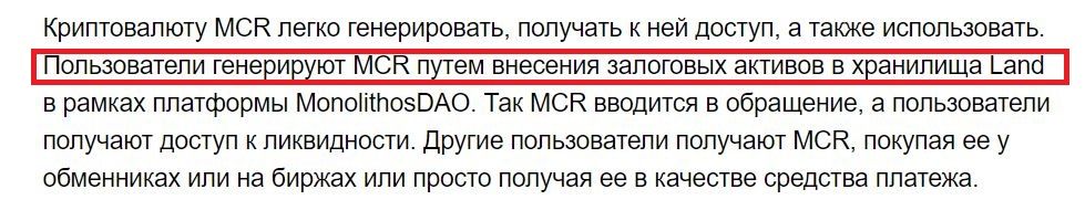 В whitepaper авторы документа поясняют, что под термином «Land» они подразумевают смарт-контракты, при помощи которых пользователь сможет получать MCR в обмен на залоговое обеспечение.