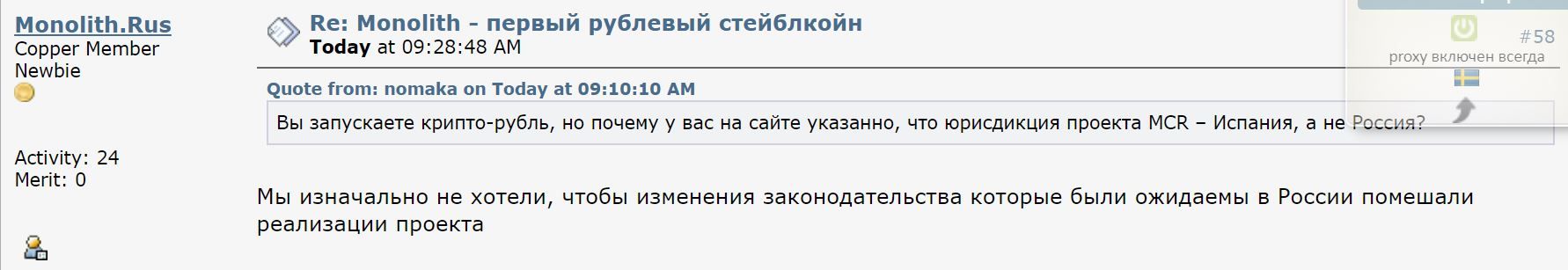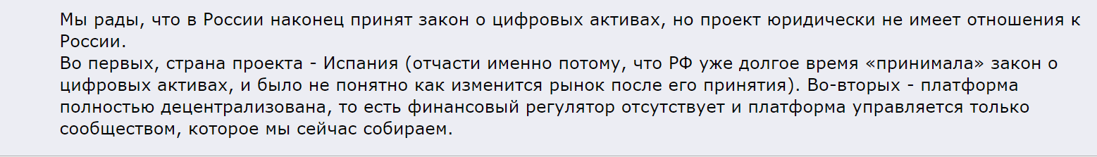 Представители Monolithos поспешили уточнить, что проект зарегистрирован в Испании. Соответственно, изменения законодательства РФ в отношении цифровых активов, по словам разработчиков, никак не затронут монету.
