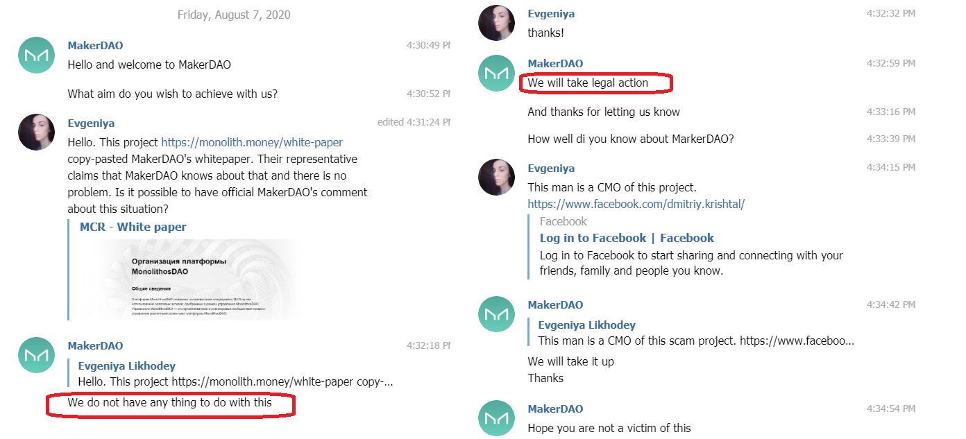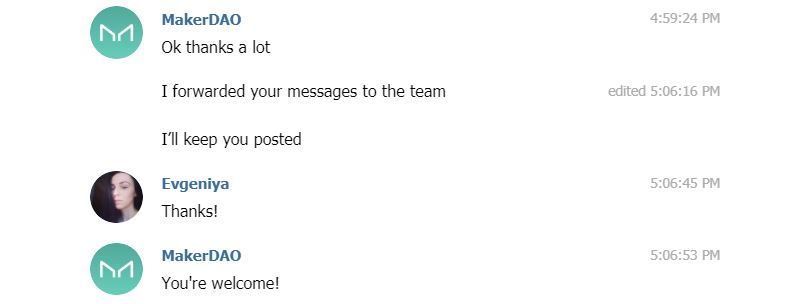Мы решили уточнить у самих MakerDAO, знают ли они о Monolithos, и давали ли представители проекта разрешение стартапу на копирование whitepaper. Для этого редакция BeInCrypto обратилась в официальный Telegram-аккаунт проекта. По словам представителя MakerDAO, они ничего не знают о Monolithos. Соответственно, проект не получал никаких разрешений. Кроме того, команда MakerDAO пообещала разобраться со стартапом.