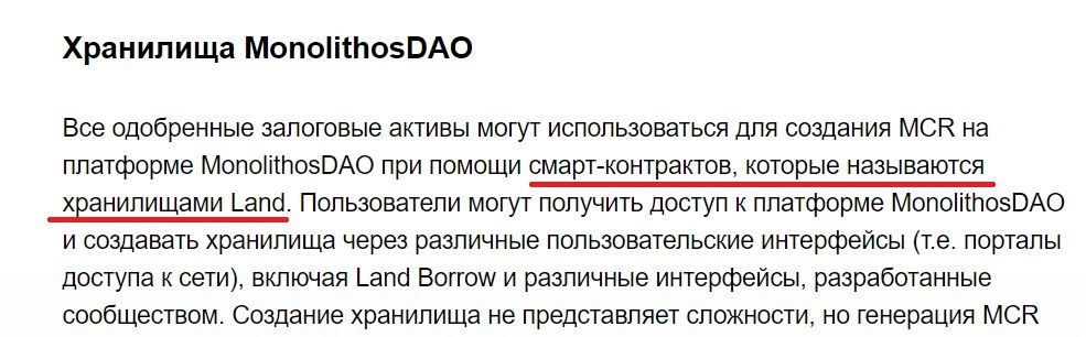 При этом в документе читателю сообщают другие сведения, согласно которым залоговые активы перемещают в хранилища Land платформы MonolithosDAO.