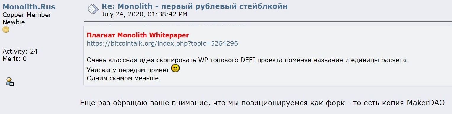 Участники криптосообщества уличили организаторов стартапа в том, что они украли whitepaper у другого проекта – MakerDAO. Представители Monolithos не стали отрицать заимствование. Примечательно, что именно в whitepaper MakerDAO можно найти объяснение загадочному «Vault».