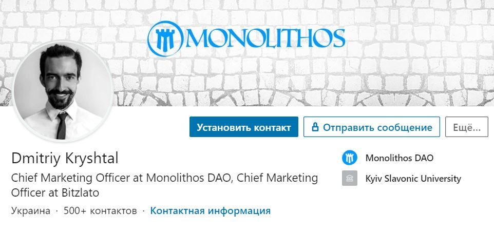На сайте Monolithos представлена краткая информация о команде. CEO не обозначен. Директором по маркетингу компании числится Дмитрий Крышталь (Dmitriy Kryshtal). На его странице в социальной сети LinkedIn указано, что он параллельно работает на такой же должности в Bitzlato. Напомним, представители Monolithos утверждают, что Bitzlato – партнер стартапа. В Twitter-аккаунте Дмитрий Крышталь позиционирует себя, в том числе, как DJ.