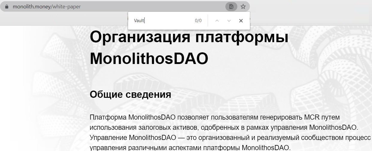 В поисках ответа, переходим к whitepaper Monolith. Информация по запросу «Vault» в документе отсутствует: