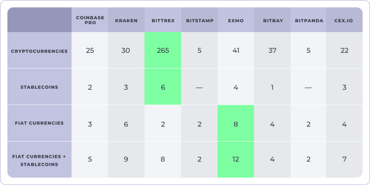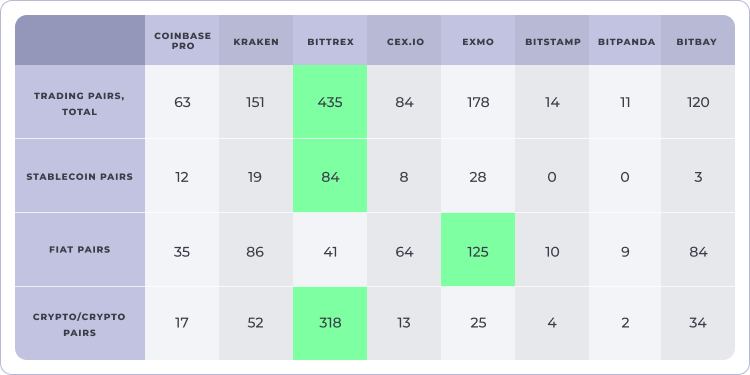 Самое большое количество криптовалютных пар, а также торговых пар в целом доступно на Bittrex. Однако лидером по количеству фиатных пар является EXMO.