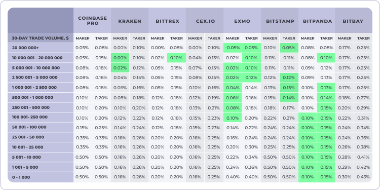 Для сравнения мы подготовили таблицу * с расчетными торговыми комиссиями выбранных бирж на основе объема торговли и типа транзакции. По каждому уровню мы выделили лучшие предложения для тейкеров и мейкеров.