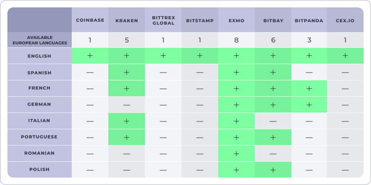Как видно, все платформы доступны на английском языке, но некоторые из них также поддерживают другие популярные европейские языки. Биржа EXMO предлагает самое большое количество (доступно восемь языков). У Kraken и Bitbay также широкий выбор. Остальным биржам стоило бы расширить языковую поддержку.