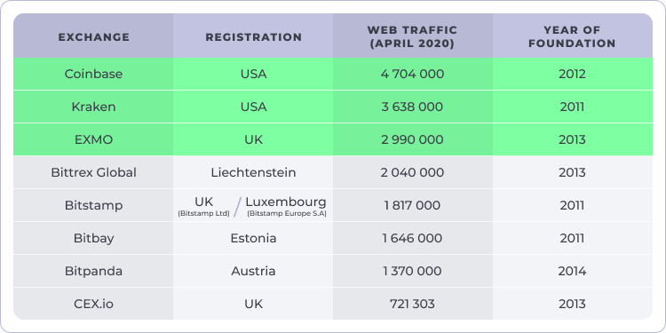 Еще один важный показатель надежности биржи — это веб-трафик платформы. Чем больше людей посещают сайт биржи и работают на нем, тем он надежнее. Биржи с самым большим интернет-трафиком — это Coinbase, Kraken и EXMO.