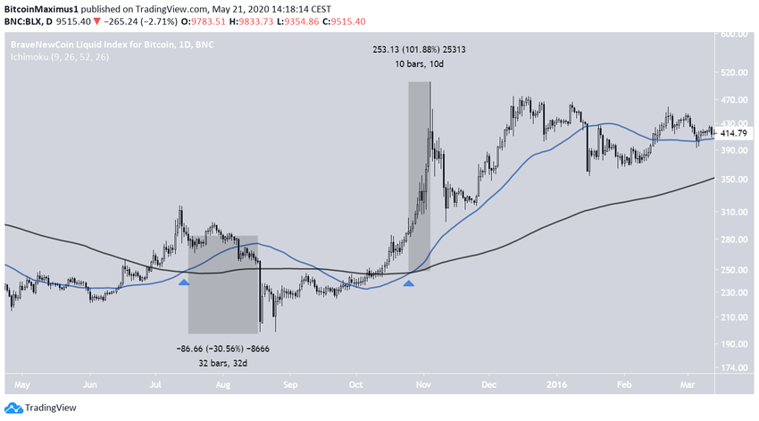 Два другие очень напоминают случаи 2015 года, описанные нами выше. Эти два пересечения также быстро появились друг за другом – в феврале и в мае 2020 года. После февральского пересечения цена упала на 62% за 24 дня.