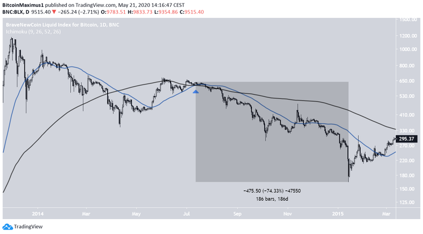 После того как в 2013 году биткоин отметил максимум, он начал долгосрочную коррекцию, затянувшуюся до января 2015 года. За это время рынок успел сформировать в июле 2014 года «золотое пересечение». Впрочем, вскоре после этого цена упала и продолжала снижение до января 2015 года. За эти 186 дней просадки валюта подешевела на 75%.