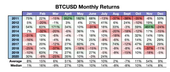 Команда Kraken проанализировала поведение BTC за полных девять лет и несколько месяцев 2020 года. Таблица с результатами, включая средние значения, выглядит следующим образом: