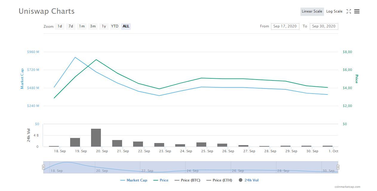 По некоторым данным, локальный максимум криптовалюты был зафиксирован 19 сентября на уровне $7,14. На момент написания материала, UNI торгуется по $4,05 (по данным ресурса CoinMarketCap). Минимум стоимости токена при этом зафиксирован на высоте $2,87 (CoinMarketCap). Получается, что рост криптовалюты в сентябре составил 41%.