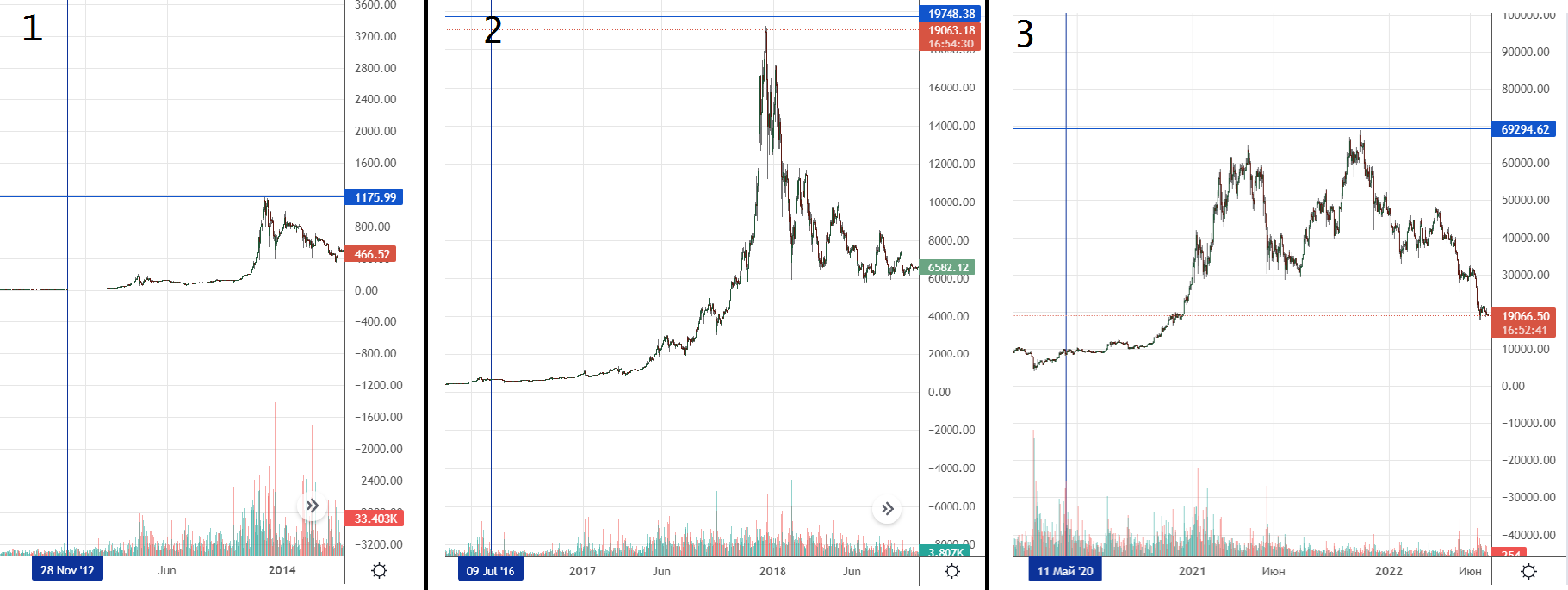 Рассмотрим тезис через анализ графика биткоина. Криптовалюта пережила три халвинга: 28 ноября 2012 года, 9 июля 2016 года и 11 мая 2020 года. Каждое из снижений скорости добычи BTC выводило монету в цикл роста, в рамках которого криптовалюта обновляла абсолютный максимум. Последний пик, по данным ресурса CoinMarketCap, зафиксирован 10 ноября 2021 года на высоте $68 789.