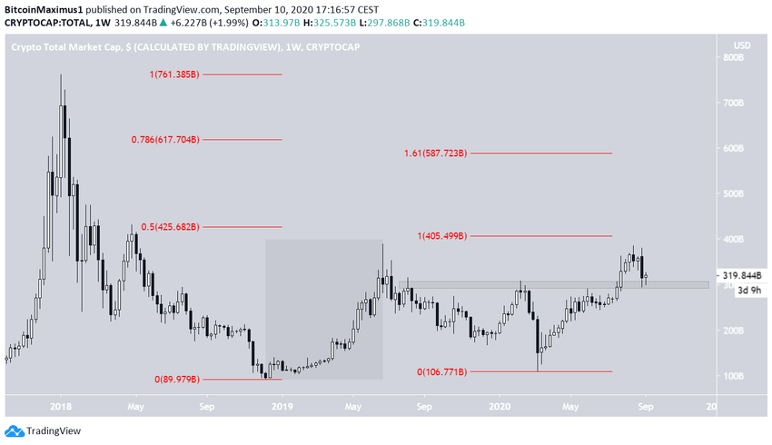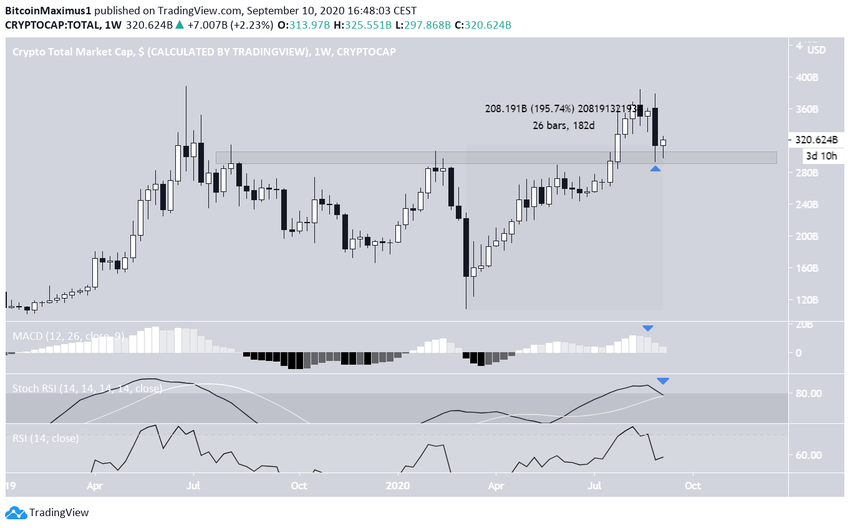 Показатель капитализации криптовалютного рынка (CRYPTOCAP) пережил в марте обвал. Это произошло 186 дней назад, и с тех пор показатель вырос на 186%. В начале сентября еще одна просадка вынудила его вернуться и проверить на прочность в качестве поддержки уровень $300 млрд. После этого произошел небольшой отскок в район ~$320 млрд, где показатель и находится на момент написания.