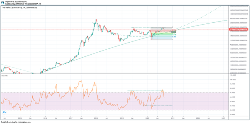 Впрочем, даже если считать текущее движение коррекцией, исходя из высоты предыдущего бычьего хода (выделен на графике), показатель CRYPTOCAP должен будет отметить максимум как минимум на $405 млрд (здесь поблизости проходит уровень Фибо 0.5 коррекции всего медвежьего хода) или в районе $587 млрд (где проходит уровень Фибо 0.786).