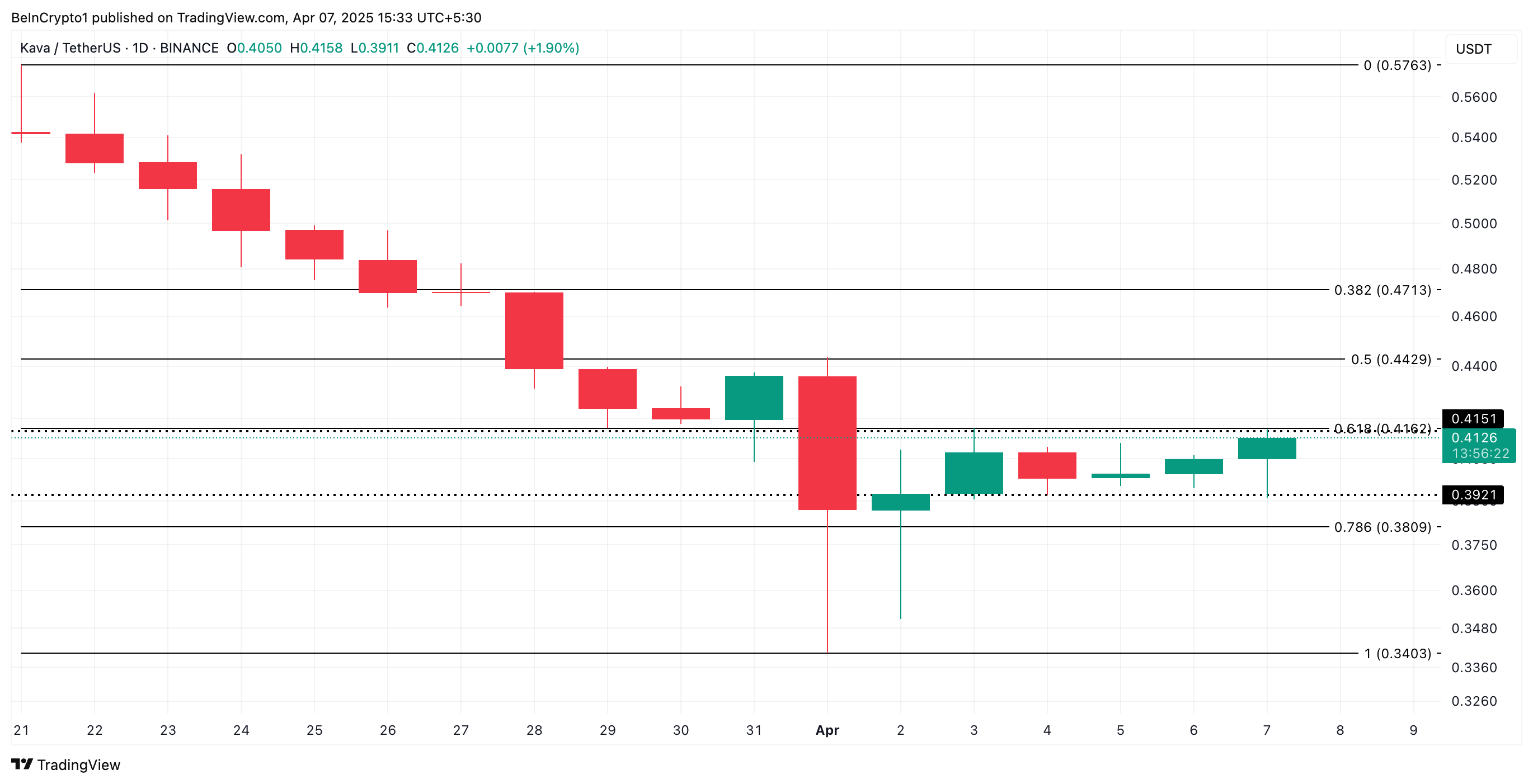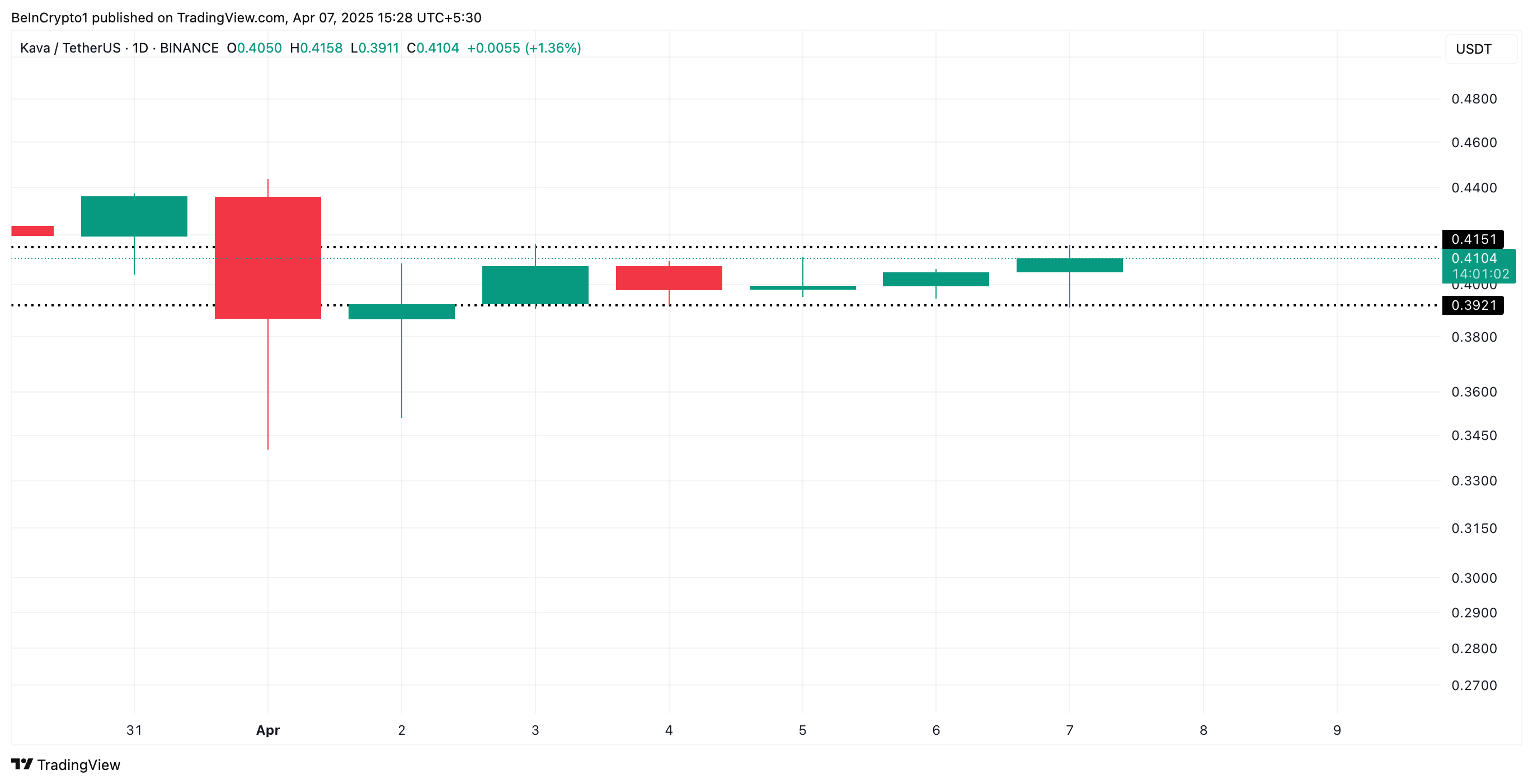 С начала апреля цена KAVA колеблется в пределах диапазона. Криптовалюта сталкивается с сопротивлением на уровне $0,415 и находит поддержку на отметке $0,392.