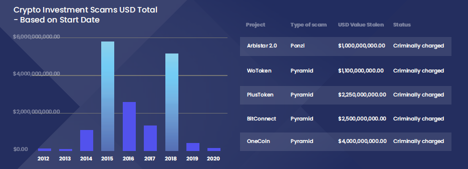 В 2017 и 2018 годах было запущено больше всего скамов, которые стоили инвесторам миллионы потерянных денег. Самыми известными мошенничествами стали Arbistar 2.0 и OneCoin, которые заполучили средства пользователей на общую сумму свыше $5 млрд.