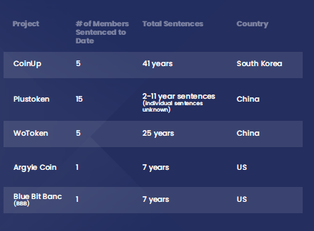 С 2012 года по 71 проекту было возбуждено уголовное дело, в результате чего было арестовано 411 человек. У PlusToken, который украл у инвесторов около 2,25 млрд долларов США, было наибольшее количество арестов: 109 человек были арестованы за свою роль в схеме, 27 из которых, как считается, сыграли ключевую роль.