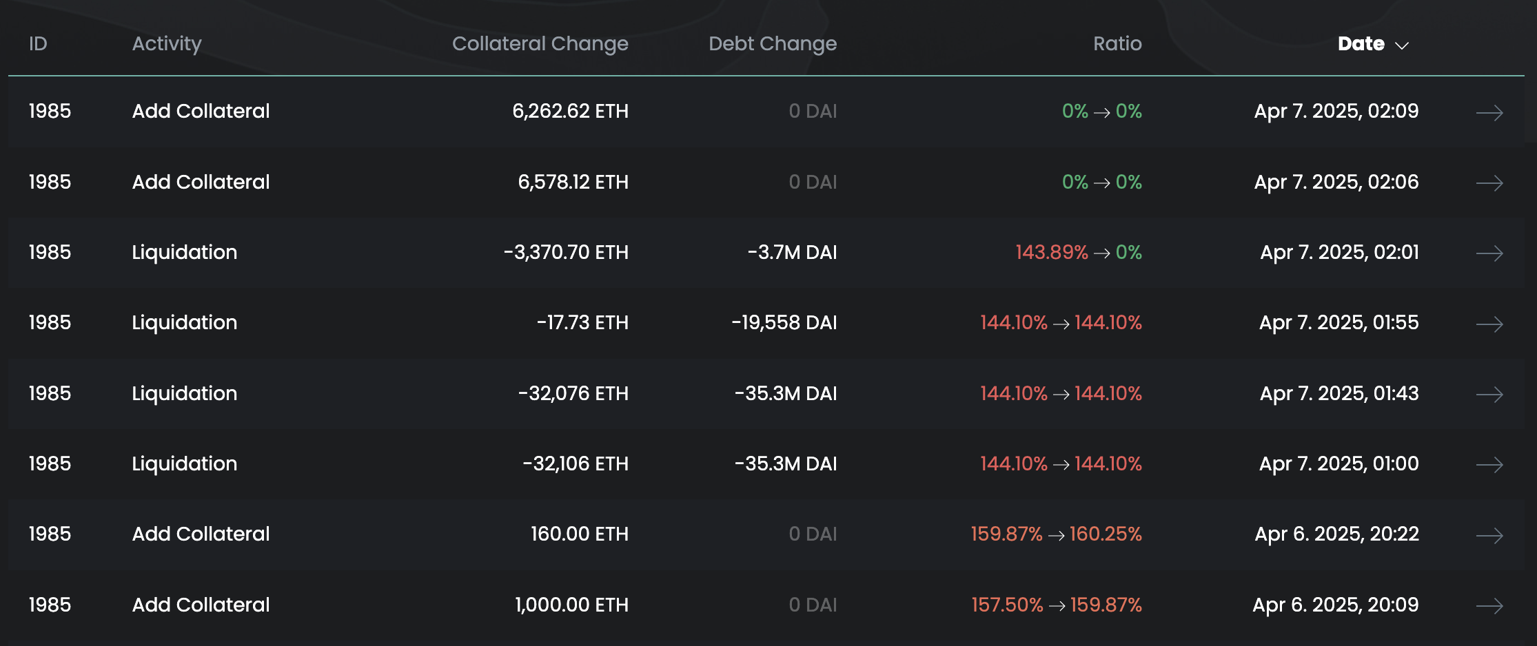 Кит изначально заблокировал 67 570 ETH (~$106 млн на момент ликвидации) на платформе Sky (бывш. MakerDAO) для создания Collateralized Debt Position (CDP). Взамен он получил кредит в стейблкоине DAI.