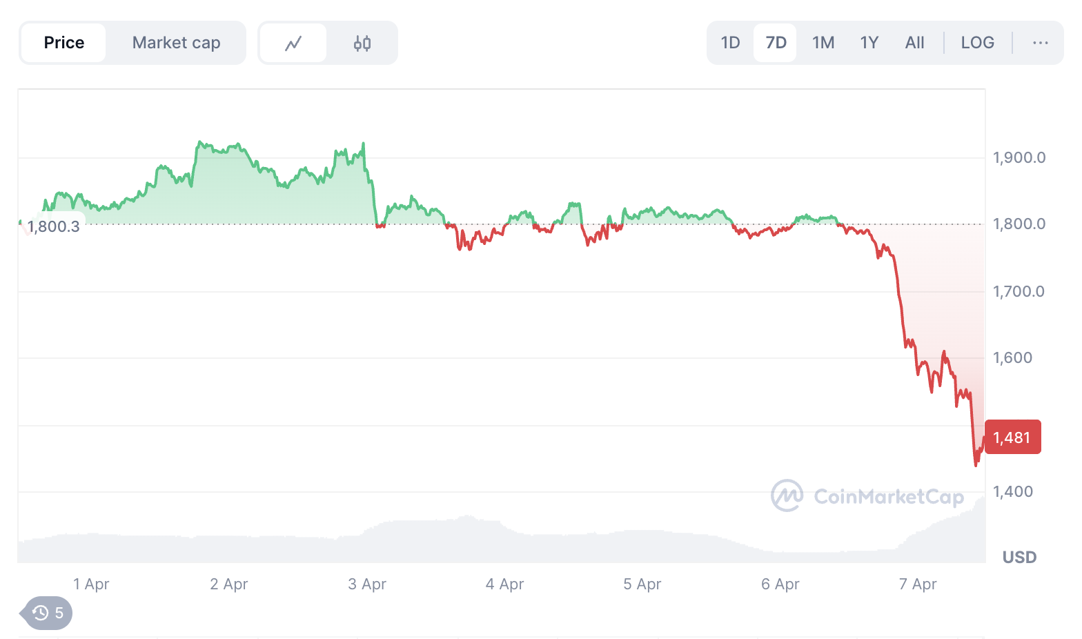 По данным CoinMarketCap, на момент написания этого материала вторая по капитализации криптовалюта торгуется на отметке $1 444. За последние сутки цена Ethereum просела почти на 20%. В последний раз ETH торговался на таких уровнях только в октябре 2023 года.